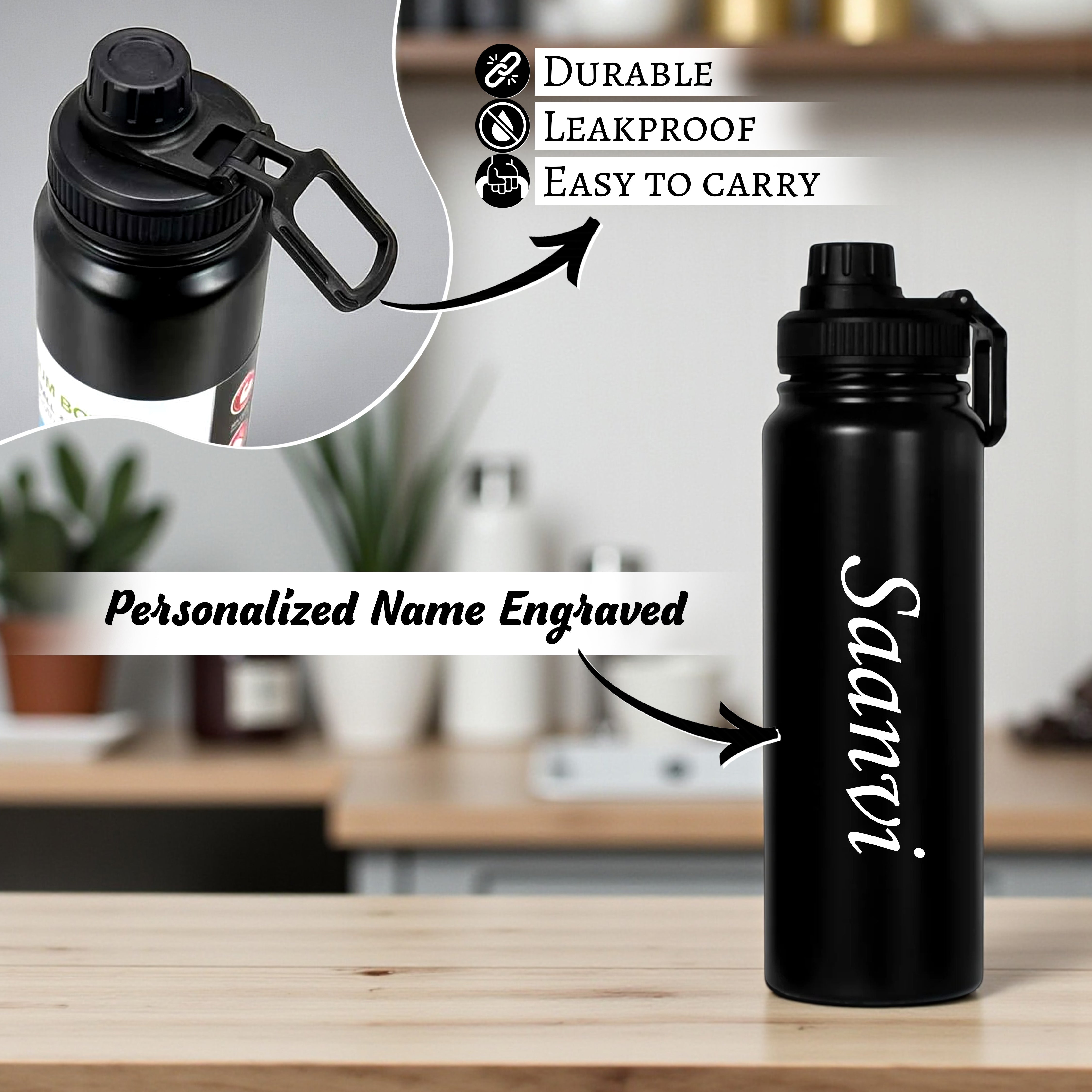 Premium 800 ml stainless steel bottle with custom name engraving and Love Click symbol for a personalized touch.