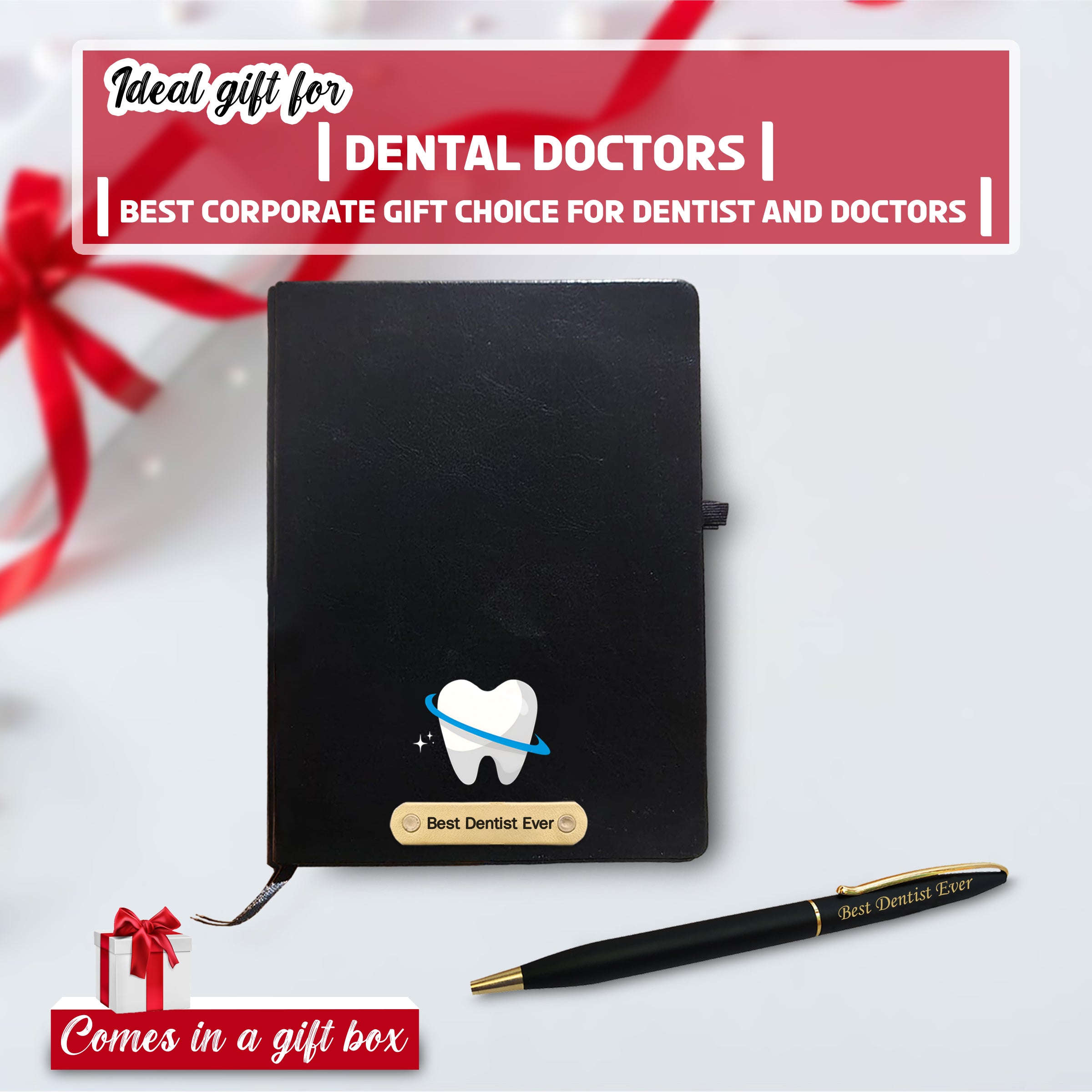 • A premium combo featuring a Black-Gold Slim Pen and A5 Diary, engraved with "Best Dentist Ever" and a dental logo.