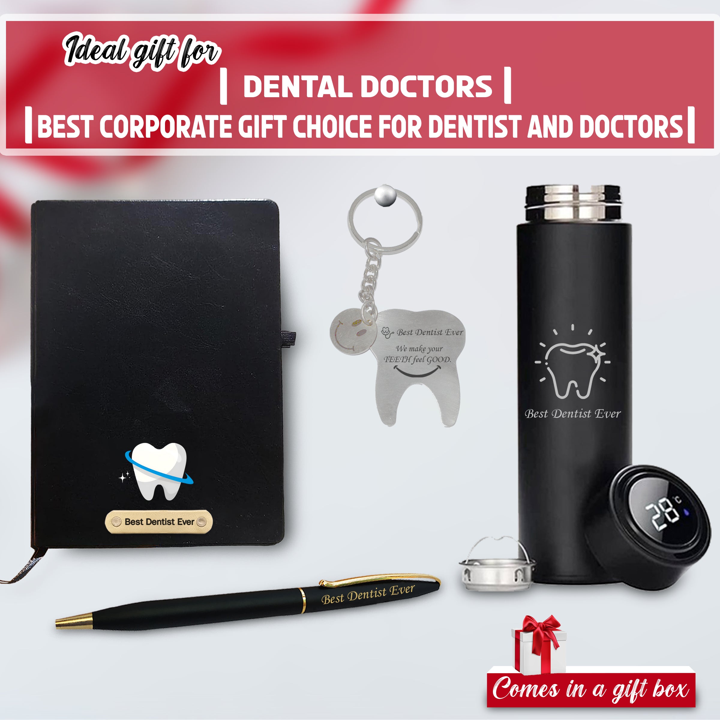 Unique Dentist Gift Set – Keychain, Pen, Bottle & Diary with ‘Best Dentist Ever’.
