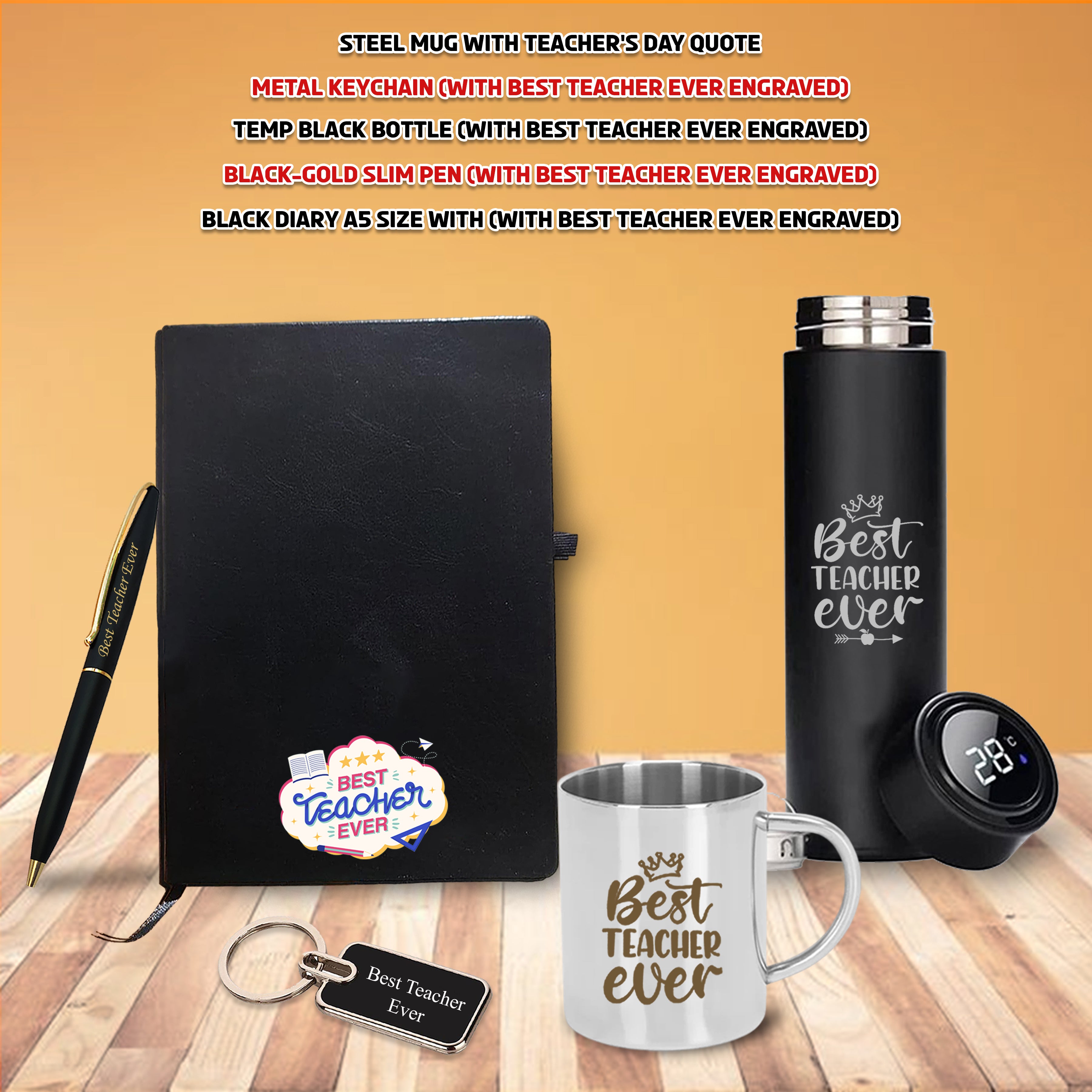 • A5 diary, engraved metal keychain,bottle, slim pen, and steel mug, all featuring the "Best Teacher Ever" inscription.