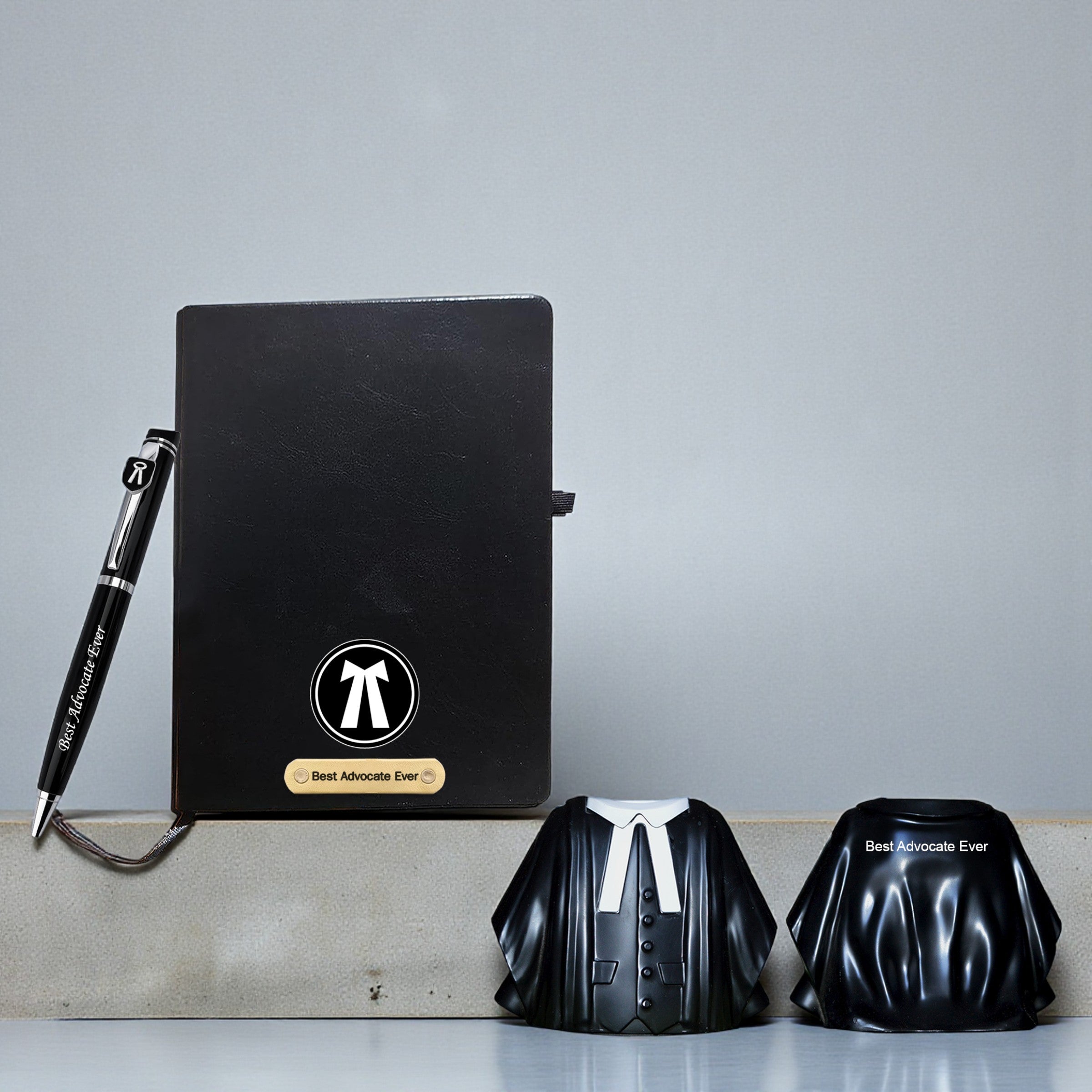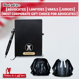 Personalized pen stand, "World's Best Advocate" engraved pen, and an A5 black diary with an advocate logo—crafted specifically for legal professionals.