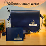 • Customized Couple Gift Set: Elegant combo of a leather men’s wallet and a stylish women’s sling bag, both personalized with names and charms for a unique touch.