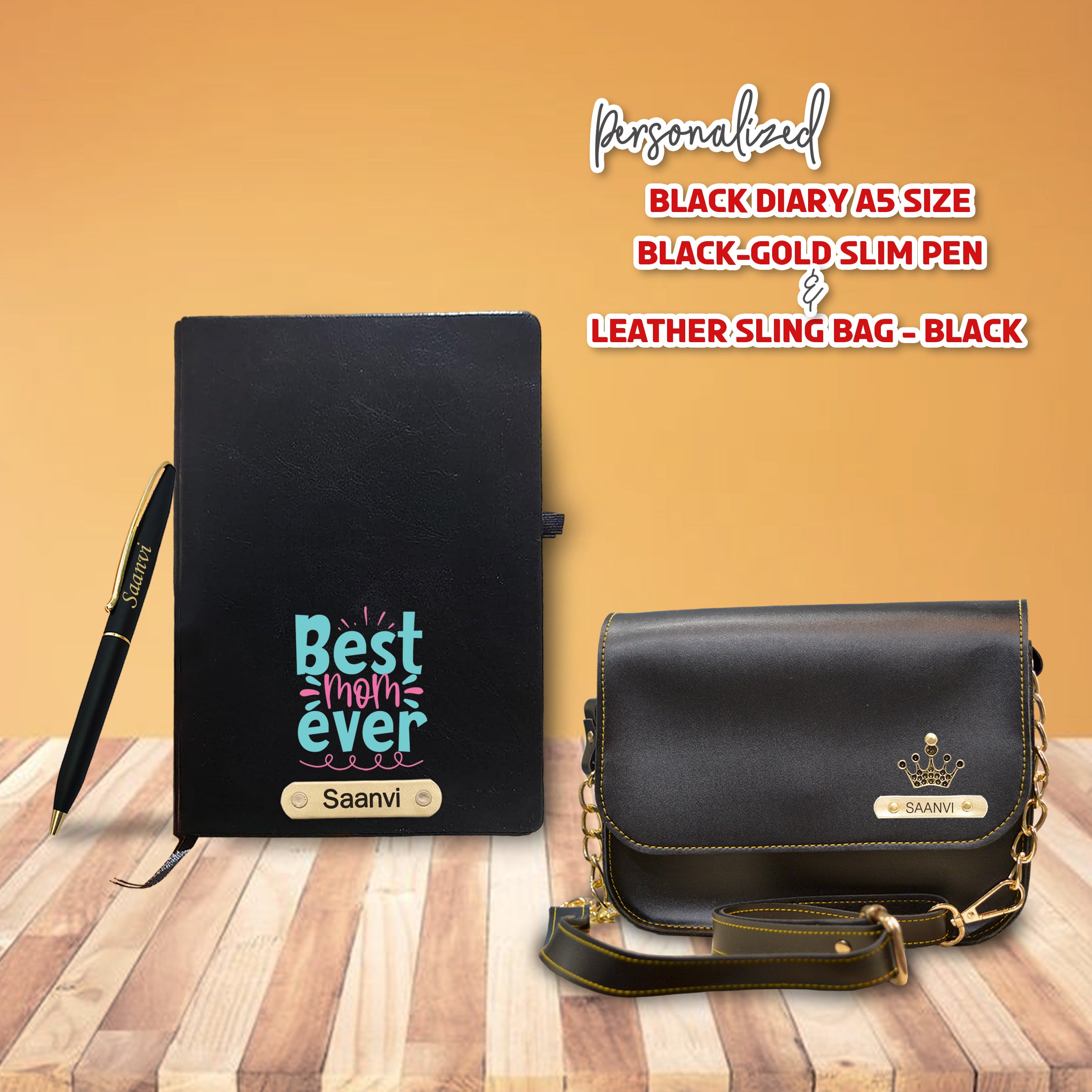 Customized Mother's Day Gift Set – Engraved Pen, 'Best Mom Ever' Diary, & Custom Sling Bag