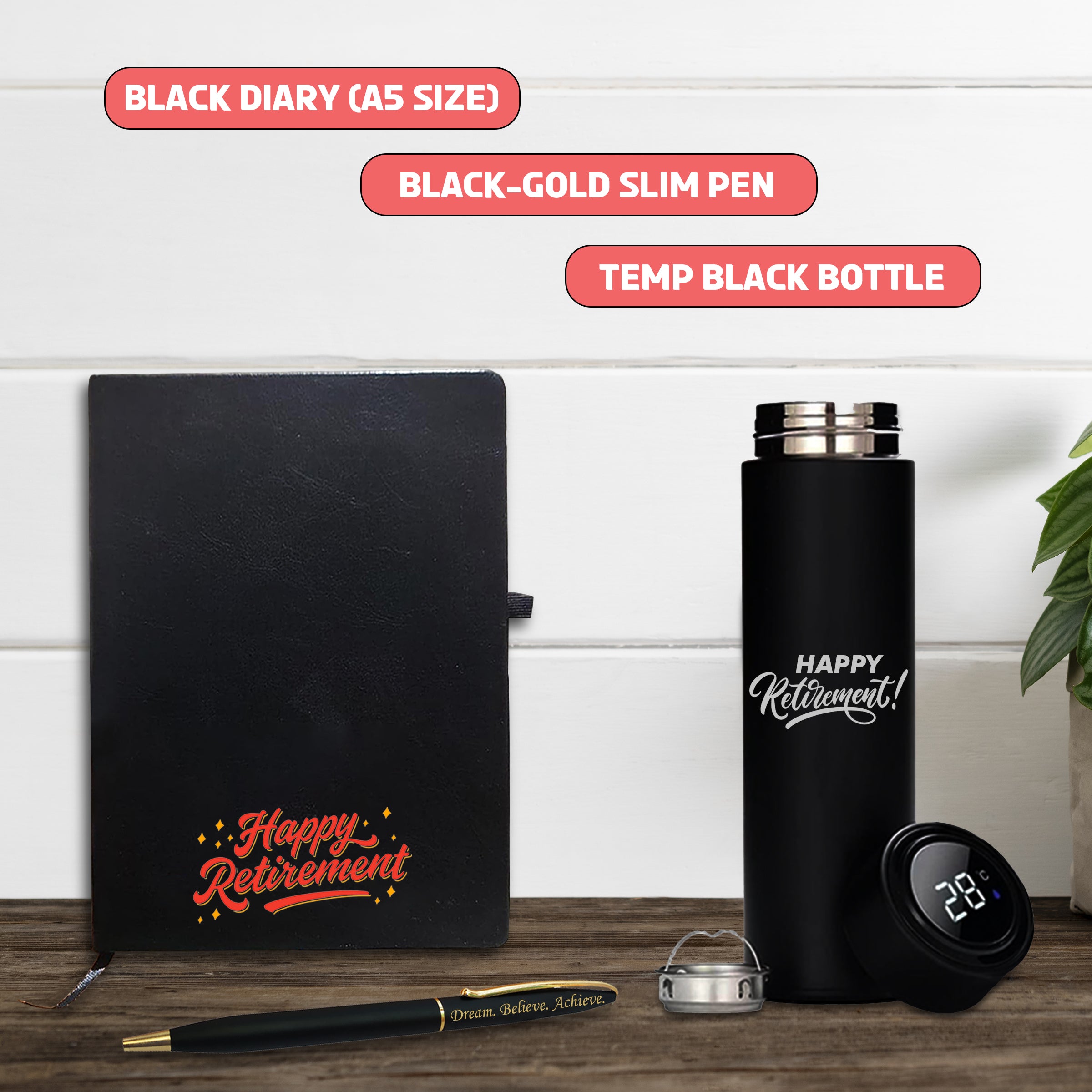Retirement Gift Set – Pen, A5 Black Diary with Quote & Temperature Bottle –